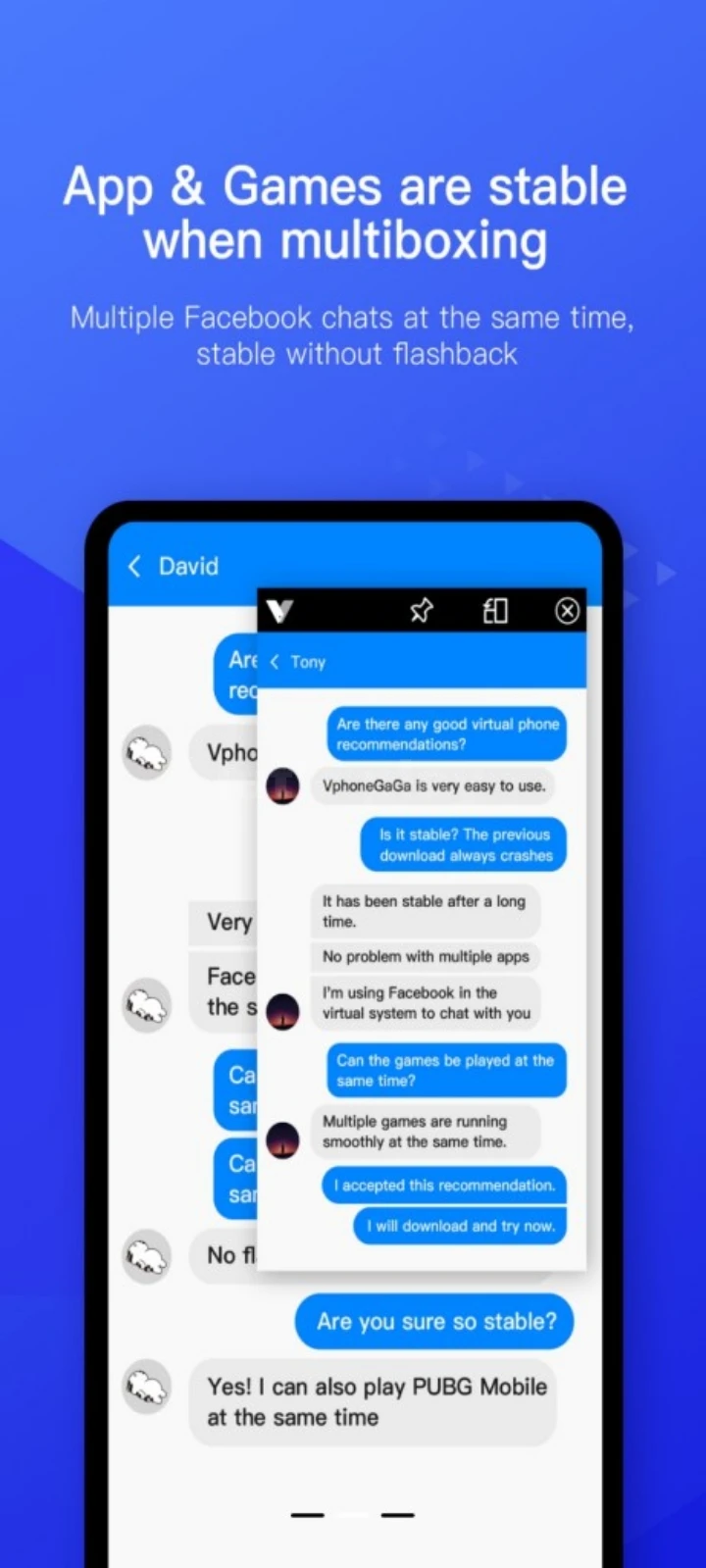 VPhoneGaga is an Android application designed to create virtual spaces for running multiple instances of the same app. It allows users to manage personal, work, and game accounts in parallel without conflicts. The app is ideal for those who want to improve productivity, test apps safely, or run multiple social and gaming accounts simultaneously.
